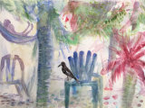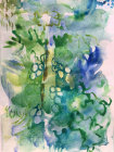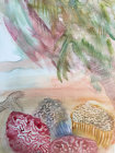 Here I started by gluing random pieces of vintage fabric to the canvas. Then, using sponges and cut up credit cards, I applied many layers of liquid paint.